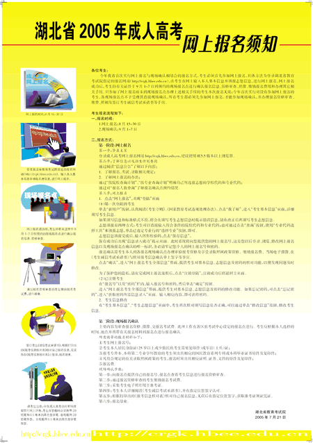 我省2005年成人高校招生全國統(tǒng)一考試采取考生網(wǎng)上報名與現(xiàn)場確認(rèn)的報名方式。考生在網(wǎng)上報名期間登陸http://crgk.hbee.edu.cn網(wǎng)址,填寫并提交報名信息,獲得網(wǎng)報系統(tǒng)分配的報名號。網(wǎng)上報名成功后,考生于現(xiàn)場確認(rèn)時間內(nèi)親自持有關(guān)證明材料到本人選擇的報名點(diǎn)電子攝像、繳費(fèi)并辦理相關(guān)手續(xù)。考生如果只進(jìn)行了網(wǎng)上報名,而未在規(guī)定時間到報名確認(rèn)點(diǎn)確認(rèn),網(wǎng)上報名數(shù)據(jù)無效,將不能參加考試。