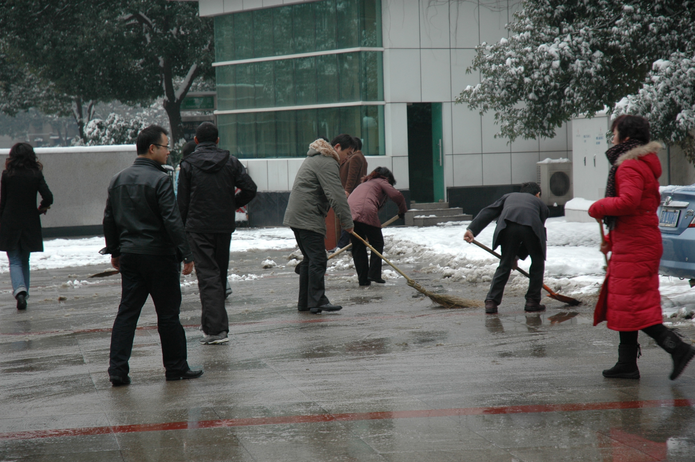 1月6日上午8點10分,院機關干部職工利用上班前時間打掃辦公樓前樓后和馬路邊積雪,經過近半個小時的打掃,門前積雪被清除干凈,保障了出入人員和車輛及過往行人的安全。