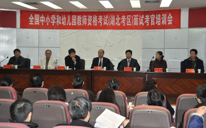 12月7日上午,全國(guó)中小學(xué)和幼兒園教師資格考試(湖北考區(qū))面試考官培訓(xùn)會(huì)在武漢體育學(xué)院舉辦。湖北省教育廳副巡視員孫望安,湖北省教育考試院副巡視員胡勝方,武漢體育學(xué)院黨委副書記黃簽名,湖北省教育考試院綜合考試辦公室主任賈勁松等有關(guān)領(lǐng)導(dǎo)及華中師范大學(xué)吳倫敦教授、華東師范大學(xué)李季湄教授、上海師范大學(xué)惠中教授、教育部考試中心相關(guān)技術(shù)人員出席會(huì)議。會(huì)議由胡勝方同志主持。