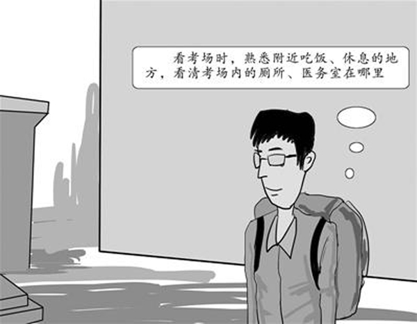 考生要留心觀察一下學(xué)校周邊環(huán)境,考試當(dāng)天提前到達(dá)后在哪里可以稍事休息、有無(wú)廁所等。還要看看考場(chǎng)附近什么地方可以吃飯、休息,是否需要預(yù)訂。進(jìn)入考點(diǎn)后,考生要先瀏覽一下學(xué)校的考場(chǎng)平面圖,對(duì)整個(gè)考場(chǎng)分布心里有個(gè)底。廁所、醫(yī)務(wù)室……這些地方考生都要提前熟悉,以備有突發(fā)狀況。