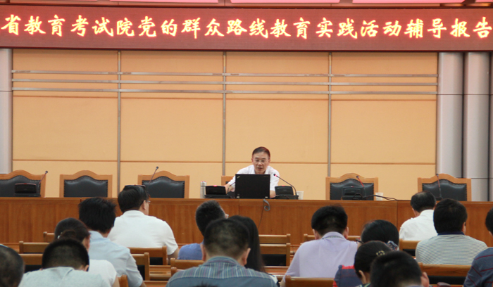 在報告結束后,劉曉林書記指出:任教授的專題報告內容豐富,深入淺出,增強了全院干部對黨的教育實踐活動的認識,對促進我院教育實踐活動的深入開展具有很強的指導性和教育意義。全院要在深入學習專題輔導報告的基礎上,認真落實省教育廳黨的群眾路線教育活動部署,做好以下幾項工作:一是不斷加強學習。通過自學、集體學、實踐學等形式,各黨支部要切實領會中央的精神和要求,在思想上,牢固樹立群眾觀點;在實踐中,堅持全心全意為人民服務的宗旨;在工作上,堅持對黨、對國家、對人民負責的一致性。二是繼續深入聽取意見。深入考生、考點、基層教育考試機構、高校,加強調查研究,通過多種方式聽取意見和建議,有針對性地抓學習、搞教育,開好民主生活會,引導黨員干部找準本單位和本人存在的“四風”問題,找到問題的癥結所在,明確努力整改的方向。三是要扎實推進作風建設。以敢抓敢管、勇于擔當的精神,拿起批評與自我批評的武器,敢于面對問題,從自己做起,從黨員干部做起。以改進作風為目標,提高辦事效率,提高服務質量,樹立良好的工作作風和形象,辦好讓人民滿意的教育考試。