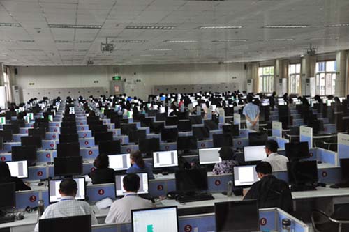 進入評卷點,須經過2道安保檢查,來到評卷監控室。透過監控室兩側的落地透明玻璃,可以清楚看到當天有200多名評卷教師整齊坐在電腦屏幕前,專注著自己的屏幕,有條不紊地對掃描、切割、加密傳輸后的試題進行評閱。