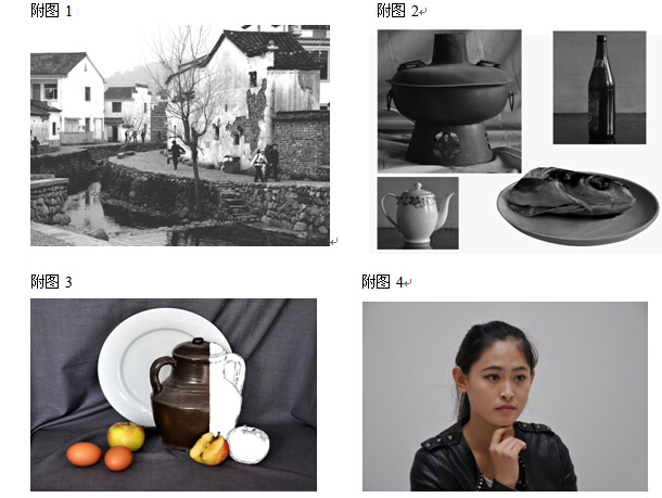 三、模擬寫生內容:一個火鍋,一個茶壺,一個啤酒瓶,一個魚頭,一個瓷盤。(圖片小樣見附圖2)