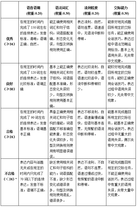 本級考試采用分題、分項評分的方法進行評分。除了按上述4個環節分為4大題外,各大題還按所涉能力不同,從語音語調、語法詞匯、流利程度、交際能力等4各方面進行評價,具體如下: